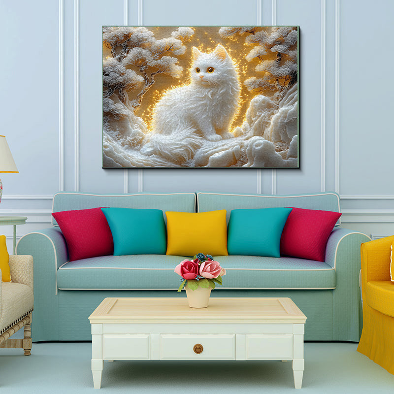 Enchanting White Cat: The central figure is a fluffy white cat with large, luminous golden eyes, its fur detailed with soft textures and a glowing aura that makes it the focal point.