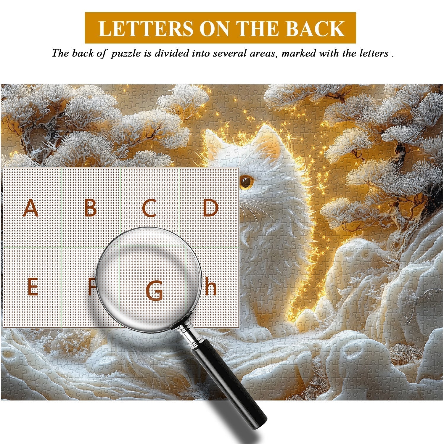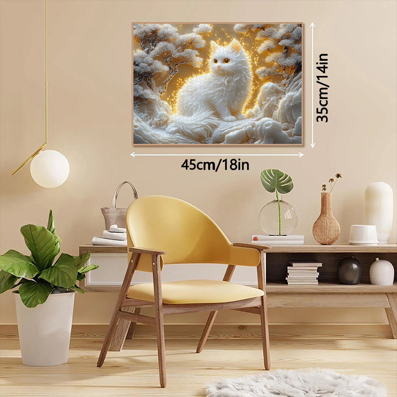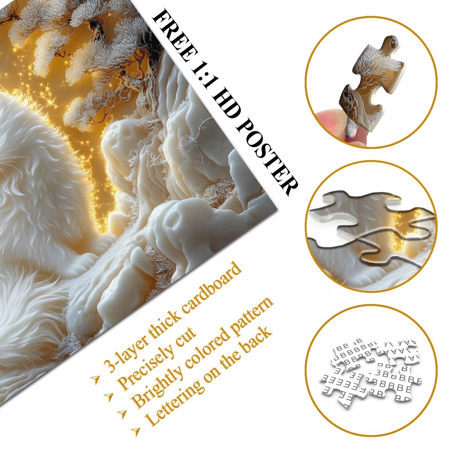 Warm Color Palette Contrast: The golden background and glowing light create a warm contrast with the cool, white tones of the cat, trees, and landscape, resulting in a visually harmonious and captivating composition.