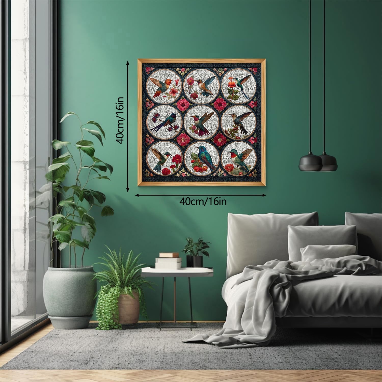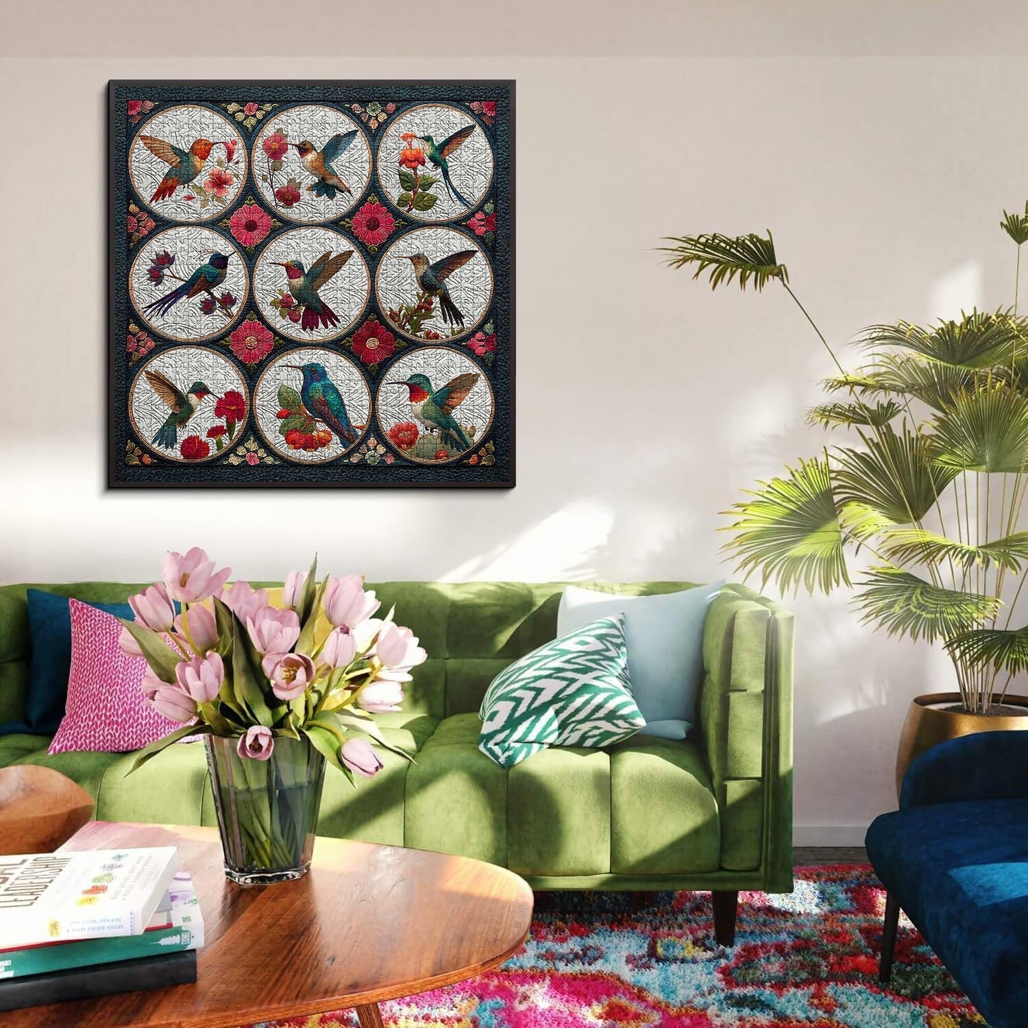 Border Design: Each circular panel containing a hummingbird and flowers is bordered with a delicate, golden trim that adds a touch of elegance.