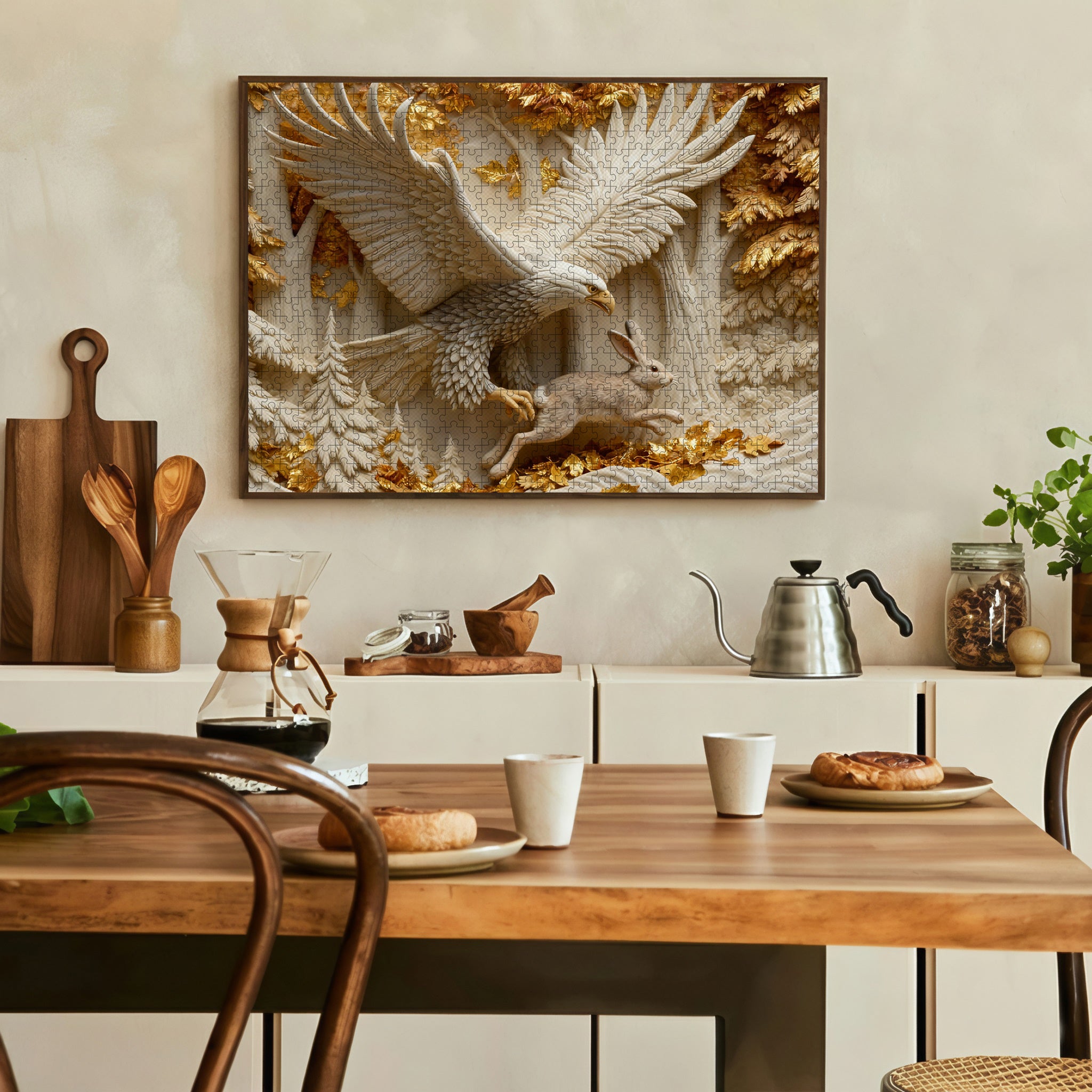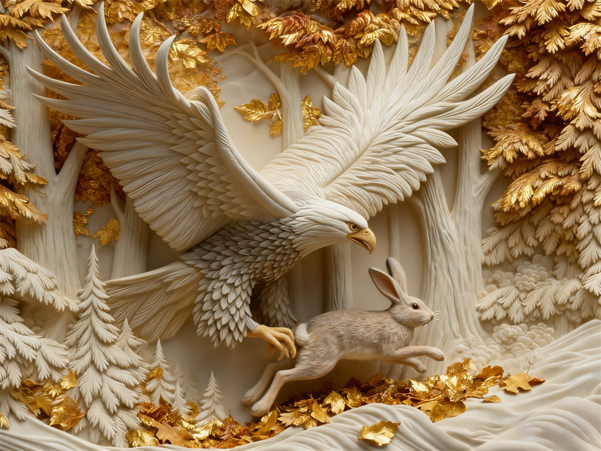 Vivid Action Pose: The eagleâs angled body and outstretched wings, paired with the hareâs darting, tense posture, freeze a moment of wild dynamismâconveying the thrill of the natural hunt.