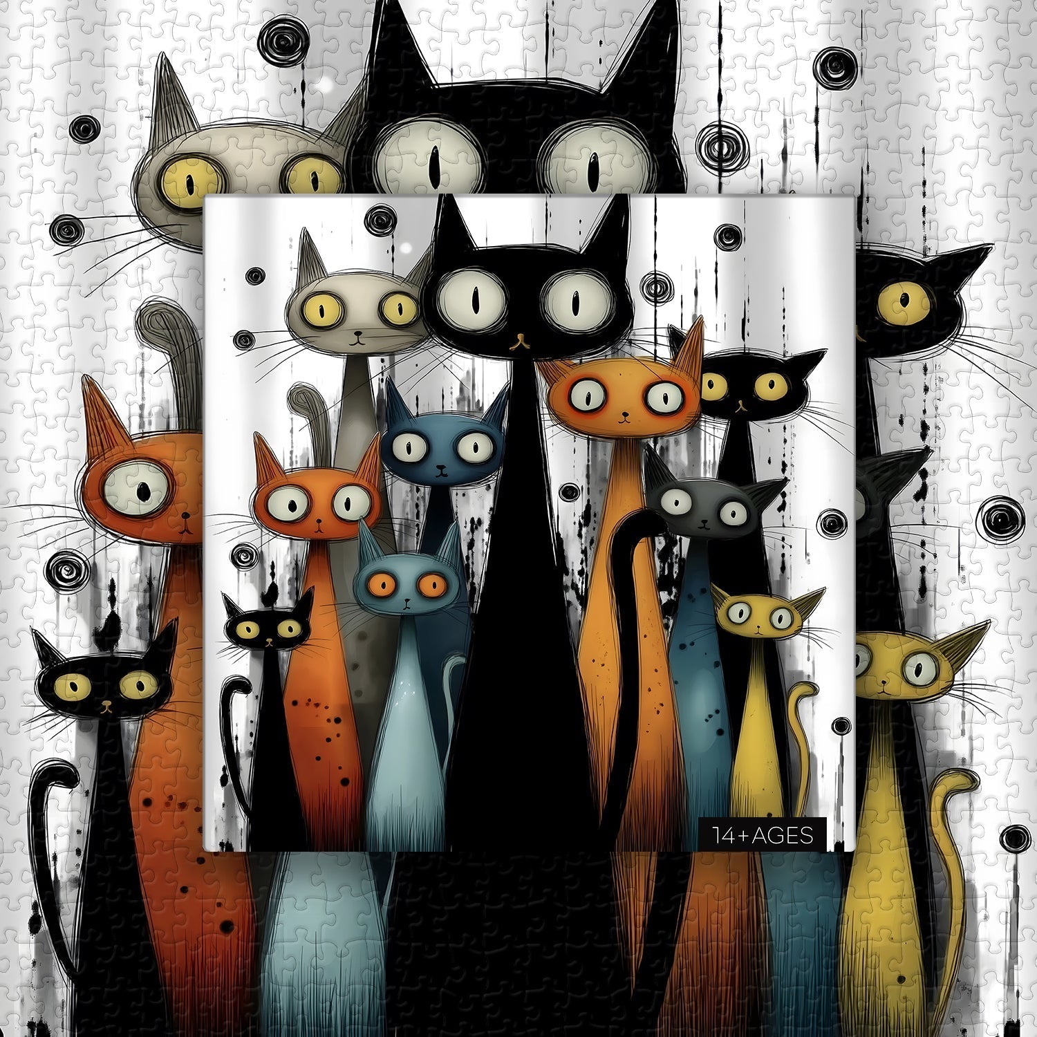 Whimsical Cat Ensemble: A group of stylized cats with exaggerated features, including large eyes and elongated bodies, forms the central subject, each with distinct colors like black, orange, blue, and gray.